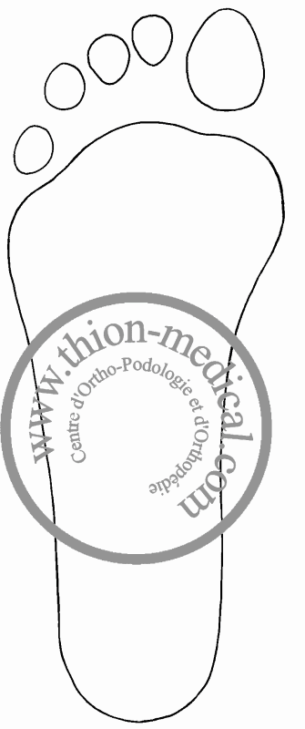Der Fußabdruck zeigt eine ovale Ferse, einen regelmäßigen Isthmus von etwa einem Drittel der Fußbreite, eine gleichmäßige Mittelfußplatte und den Kontakt aller fünf Zehen zum Boden.