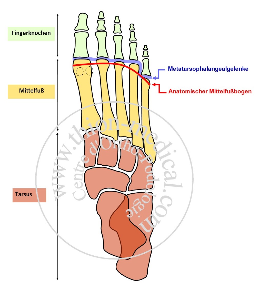 In der Orthopädie konzentrieren wir uns insbesondere auf zwei Bereiche des Fußes, da diese häufig die Ursache für Beschwerden sind, die den Einsatz von orthopädischen Einlagen rechtfertigen. Dies sind die Ferse, die den Aufprall des Fußes auf den Boden abfedert, und die Metatarsophalangealgelenke, die die Abrollbewegung des Fußes ermöglichen. Die Ferse besteht aus dem Fersenbein (Calcaneus), da dieses beim Gehen oder Laufen als erstes den Boden berührt. Es dämpft die Vibrationen des Aufpralls. Die Achillessehne, die an der Rückseite des Fersenbeins ansetzt, und die darunter liegende Plantarfaszie sind diesen Stoßwellen und den damit verbundenen mechanischen Belastungen ausgesetzt. Es ist leicht vorstellbar, dass dieser Bereich im Laufe der Zeit von verschiedenen Erkrankungen oder biomechanischen Störungen betroffen sein kann, wie beispielsweise Achillessehnenentzündung, Plantarfasziitis oder Fersensporn. Die fünf Metatarsophalangealgelenke sind die einzigen mit einem nennenswerten Bewegungsumfang in Beugung und Streckung. Dieses Gelenk, das ein Scharnier zwischen Fußkörper und Zehen bildet, ist erheblichen mechanischen Belastungen ausgesetzt. Tatsächlich ist dieser Bereich an der Landung und dem Absprung bei Sprüngen beteiligt, seine hohe Beweglichkeit trägt zur Aufrechterhaltung des Gleichgewichts bei vertikalen Bewegungen bei und er muss mitunter durch hohe Absätze eine unnatürliche Gewichtsverteilung abfangen. Die Köpfe dieser fünf kleinen Gelenke sind daher sehr oft die Ursache zahlreicher Schmerzen, wie beispielsweise Metatarsalgie.