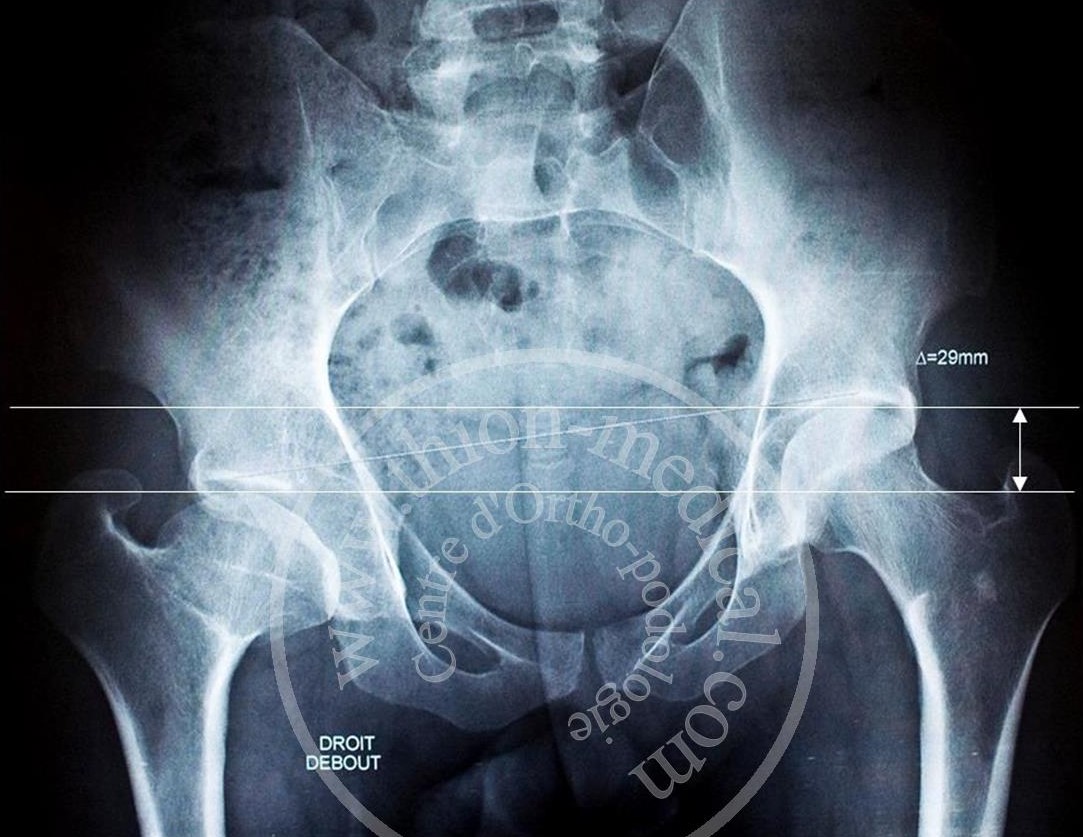 Une Jambe plus courte que l’autre se confirme en prenant une radiographie du bassin de face. On mesure ainsi le déficit en mm, en comparant la différence de hauteur entre les sommets des têtes fémorales droite et gauche.