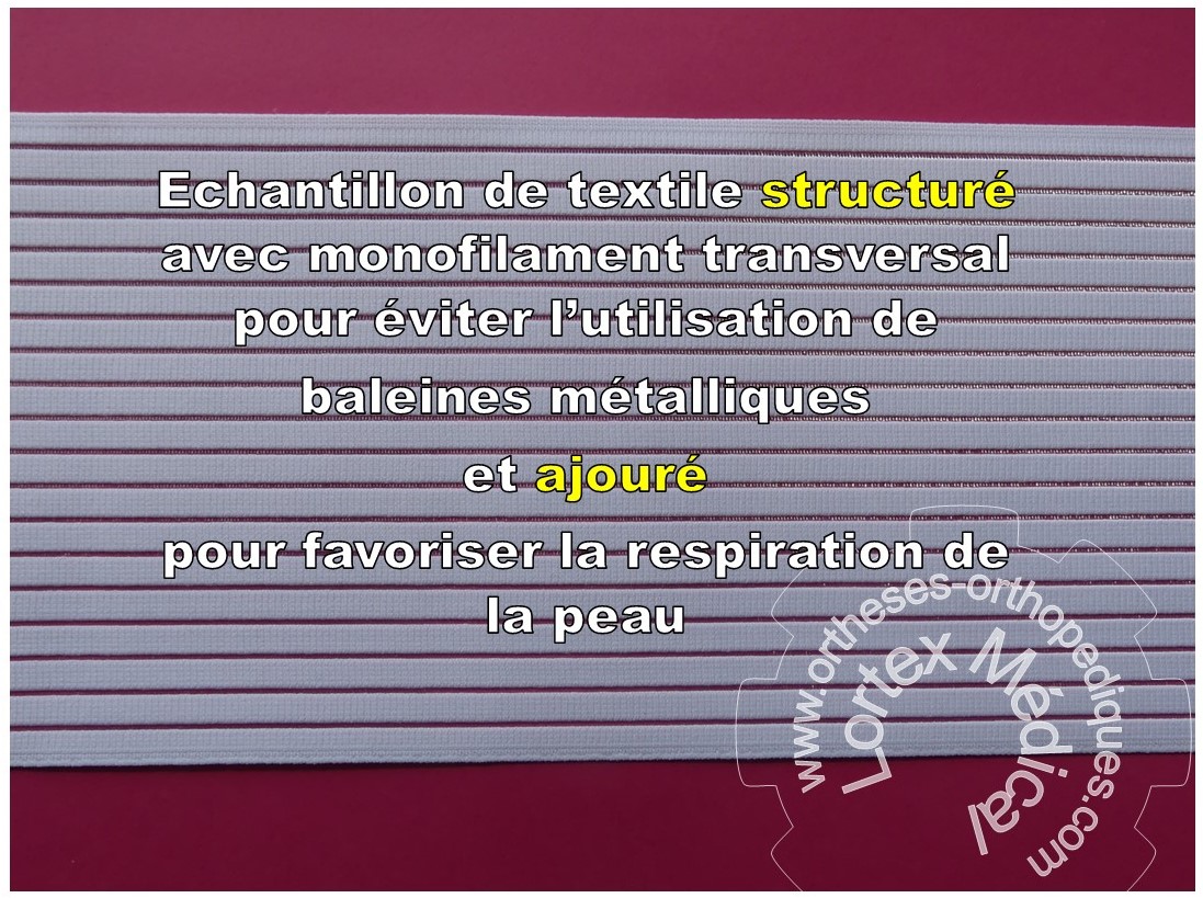 Elle est réalisée avec un tissu élastique à hautes performances techniques. Son tissage intègre un monofilament qui permet de s’émanciper des baleines métalliques (qui sont le principal reproche d’inconfort des utilisateurs). Ce crin polyamide résistant évite le retournement et au pli du textile quand le patient se baisse ou s’assoie. De plus son maillage est ajouré pour permettre une aération de la peau.